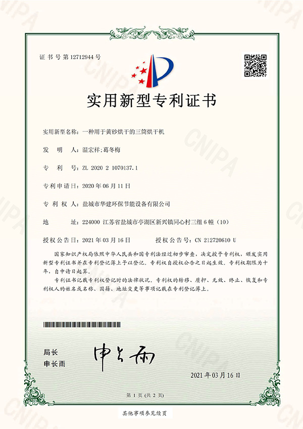 一種單筒回轉烘干機-實用新型專利證書